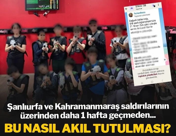 Şanlıurfa ve Kahramanmaraş’ta yaşanan sarsıcı olayların ardından aileler güvenlik endişesi taşırken, Kayseri Sınav Koleji’nin 5. sınıf öğrencilerini “Lazer Game” etkinliğine götürdüğü ortaya çıktı. Etkinlik kapsamında çocukların eline silah benzeri ekipman verilmesi görüntüleri kamuoyunda tepkiye neden oldu. Türkiye’de şiddet olayları ve çocuk güvenliği tartışılırken, 1012 yaş grubundaki öğrencilerin “eğlence” adı altında savaş temalı bir oyuna yönlendirilmesi veliler arasında infial yarattı.