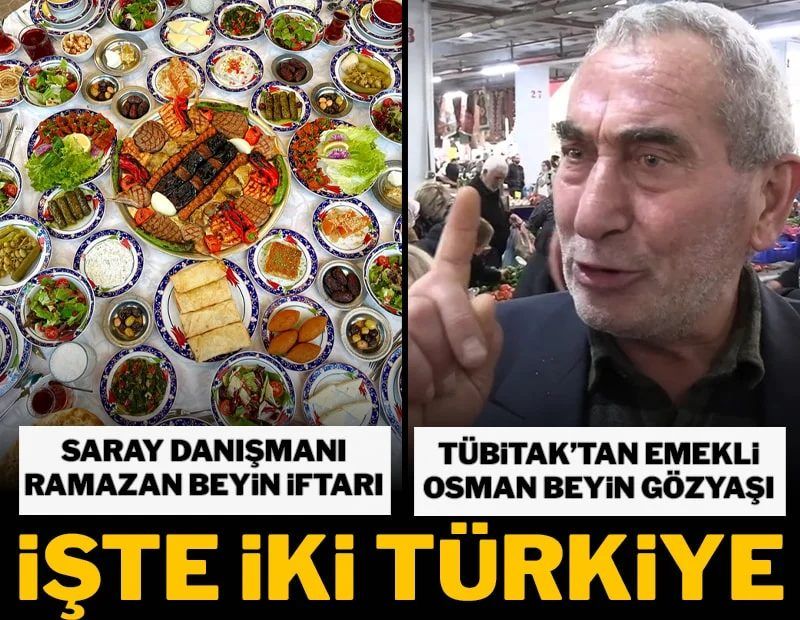 Saray danışmanı Ramazan Bingöl’ün VIP odalı et lokantasındaki iftar sofrasında şunlar var: Çorba çeşitleri, dana kebap, kuzu pirzola, tavuk ızgara, humus, haydari, turşu, salata, yaprak sarma, hurma, peynir, sigara böreği, içli köfte, revani, kadayıf, irmik tatlısı, ayran, çay, şalgama kadar olmayan yok. Bu iftar yemeğinin fiyatı kişi başı KDV hariç 2 bin 900 TL. Vatandaş ise menüye bakıp iç çekiyor.