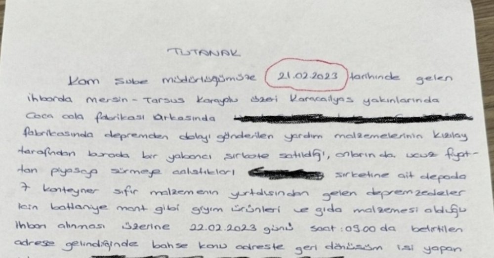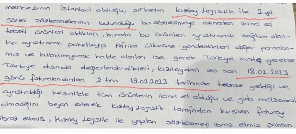 "KOM Şube Müdürlüğümüze 21.02.2023 tarihinde gelen ihbarda MersinTarsun Kaarayolu üzerine Karacailyas yakınlarında Coca Cola fabrikası arkasında... fabrikasında depremden dolayı gönderilen yardım malzemelerinin Kızılay tarafından burada yabancı bir şirkete satıldığı, onların da, ucuz fiyattan piyasaya sürmeye çalıştıkları... şirketine ait depoda 7 konteyner sıfır malzemenin yurtdışından gelen depremzedeler için battaniye mont gibi giyim ürünlerini ve gıda malzemesi olduğu ihbarı alınan üzerine 22.02.2023 günü saat 09.00'da belirtilen adrese gelindiğinde bahse konu adreste geri dönüşüm işi yapan merkezinin İstanbul'da olduğu, şirketin Kızılay Lojistik ile 2 yıl süreli sözleşmelerinin bulunduğu bu sözleşmeye istinaden ikinci el tekstil ürünleri aldıkları, burada bu ürünleri ayıştıracak sağlam olanları ayrıştırarak paketleyip Afrika ülkesine gönderdikleri diğer parçalanmış ve kullanılmayacak halde olanları ise gerek Türkiye içinde gerek Türkiye dışında değerlendirdikleri, Kızılaydan en son 18.02.2023 günü fiyatlandırılan 2 tırın 19.02.2023 tarihinde tesise geldiği ve ayrıştırdığı kesinlikle tüm ürünlerin ikinci el olduğu ve gıda malzemesi almadığını beyan ederek Kızılay Lojistik tarafından kesilen faturayı ibraz etmiş..."