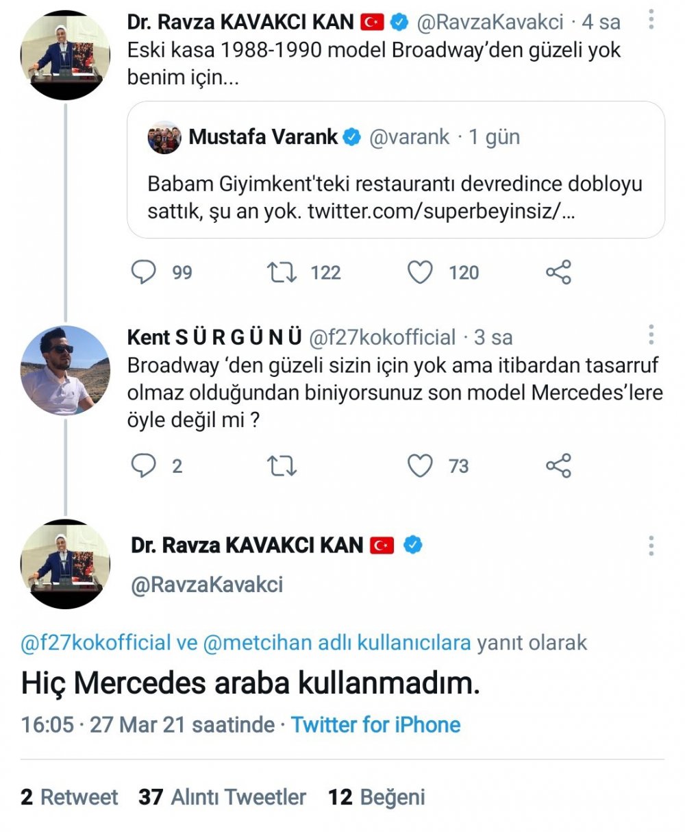 Bu tweeti alıntılayarak "Eski kasa 19881990 model Broadway’den güzeli yok benim için..." yazan Kavakcı Kan'a takipçilerinden biri "Öyle olduğu için mi Mercedes'e biniyorsunuz?" diye sordu. Bunun üzerine Ravza Kavakcı Kan, hiç Mercedes araba kullanmadığını söylemişti.