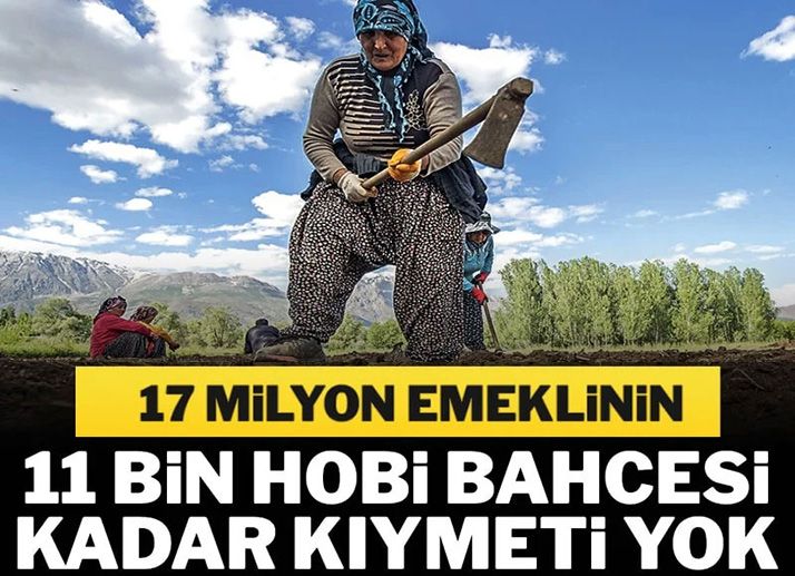 17 milyon emeklinin feryadını dikkate almayan iktidar 11 bin hobi bahçesinin peşine düştü. Emekliler açlık ve yoksulluk sınırının altında yaşamaya çalışırken, yılbaşında en düşük emekli maaşına sadece 3 bin 119 lira zam yapıldı. 16 bin 881 liralık maaş 20 bin liraya çıktı. 4.9 milyon emekli 20 bin lira, emeklilerin yüzde 90’ı ise 25 bin lira ve altında maaş alıyor. ‘Kaynak yok’ denilerek emekli bayram ikramiyesine de zam yapılmadı.
