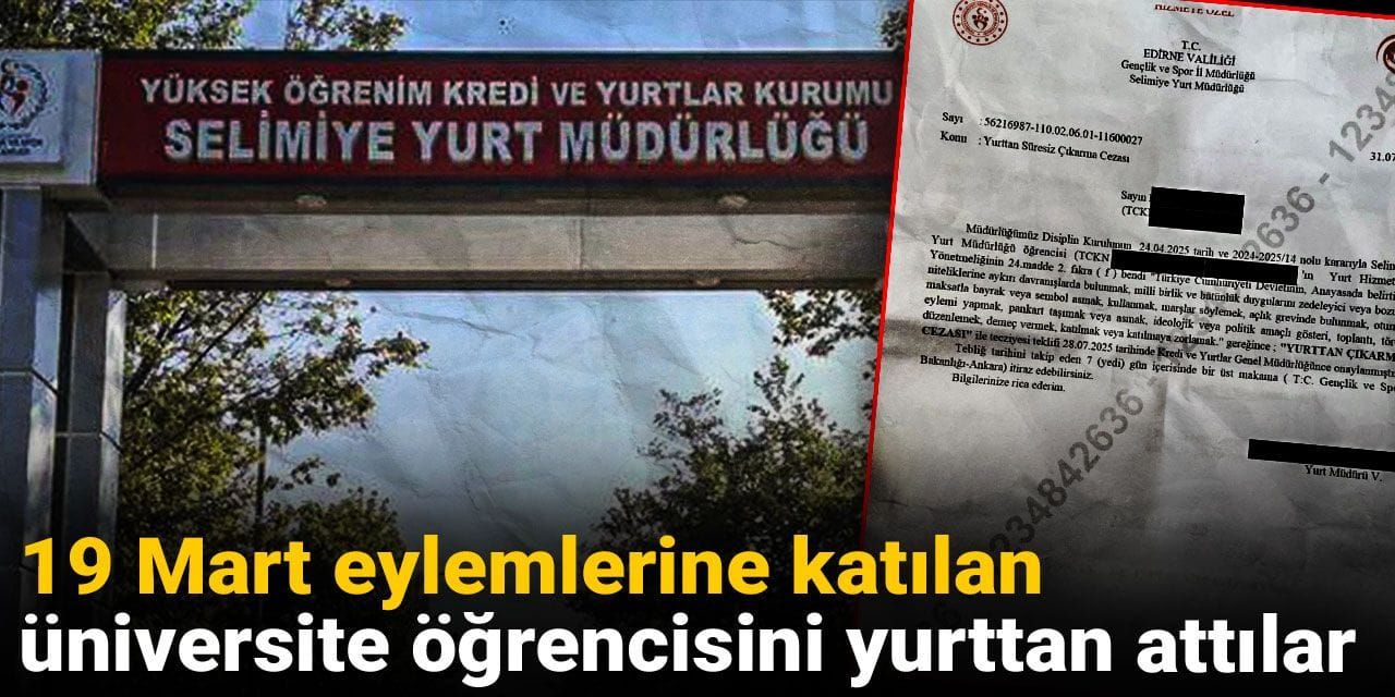Edinilen bilgilere göre 19 Mart eylemlerine katılan ve gözaltına alınan Trakya Üniversitesi üçüncü sınıf öğrencisine, bir süre sonra Selimiye Yurt Müdürlüğünden, "yurttan atıldığına" ilişkin tebliğde bulunuldu.