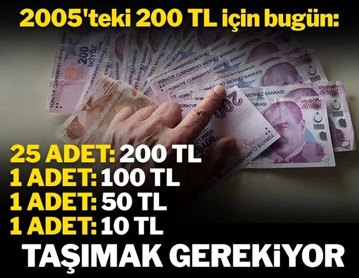 “Paradan 6 sıfır atılınca, ocak 2005’te en byük banknot olarak 200 TL çıkarıldı. O günkü 200 TL’nin satın alma gücü olarak bugünkü karşılığı (TÜFE’ye göre) 5 bin 161 TL’dir.