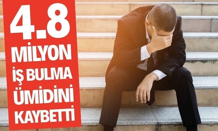 İşsizliğin vatandaşları sürüklediği umutsuzluk ve bunalım, TÜİK verilerine de yansıdı. İş bulma ümidi olmayanların sayısı bir önceki çeyreğe göre 121 bin kişi artarak 2 milyon 616 bine yükseldi. İşbaşı yapabilecek olup iş aramayanların sayısı ise 189 bin kişi azalarak 2 milyon 274 bine geriledi. Son 4 yılda iş bulma ümidi olmayanların sayısı yüzde 59, işbaşı yapabilecek olup iş aramayanların sayısı ise yüzde 74 artış gösterdi. Böylece resmi verilere göre, 4 milyon 890 bin kişi ya iş bulma ümidini kaybetti ya da iş aramayı bıraktı.
