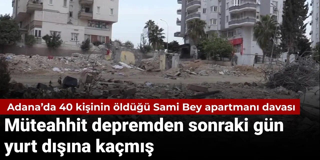Adana'da, 6 Şubat depremlerinde 40 kişinin yaşamını yitirdiği Sami Bey Apartmanı davasında sanık müteahhit Abdullah Aybaba’nın depremden bir gün sonra, İstanbul Havalimanı’ndan yurt dışına çıkış yaptığı ve bu tarihten sonra Türkiye'ye giriş kaydının bulunmadığı öğrenildi. Davanın dördüncü duruşmasında, müteahhit Aybaba'nın avukatı, müvekkilinin yurt dışında olduğunu belirterek, "Müvekkil hakkında çıkarılan tutuklamaya yönelik yakalama emrinin kaldırılarak, savunmasının alınmasının ardından serbest bırakılmasına yönelik yakalama emri düzenlenmesini talep ediyoruz" dedi. Mahkeme, talebi reddetti.