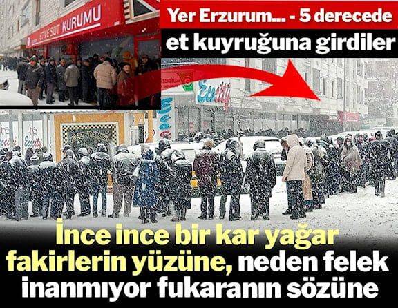Hükümetin uyguladığı ekonomi politikaları sonucu yaşanan ekonomik kriz her geçen gün etkisini artırıyor. Erzurum'da vatandaşlar ucuz et alabilmek için eksi 5 derece soğuk ve yoğun kar yağışı altında Et ve Süt Kurumu (ESK) mağazası önünde uzun kuyruklar oluşturuyor. ESK önündeki manzara akıllara Mahzuni Şerif'in ‘ince ince bir kar yağar fakirlerin üstüne' türküsünü getirdi.