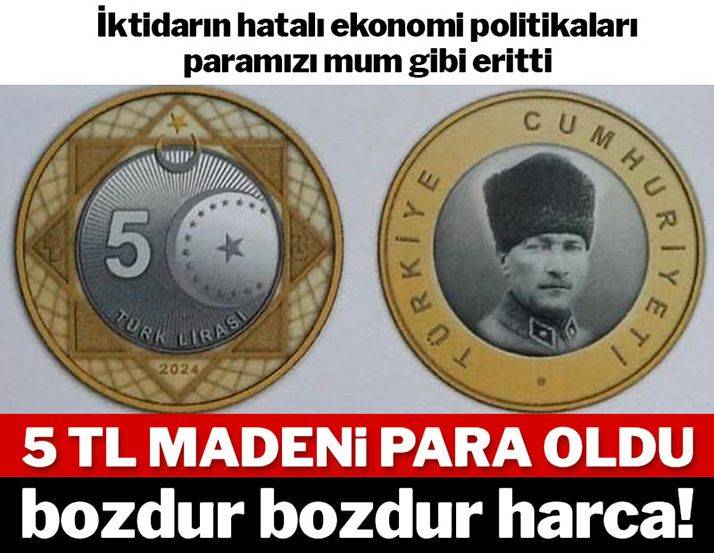İtibar kaybı korkusuyla 500 TL ve 1.000 TL’lik banknotlar tedavüle çıkarmamakta direnen iktidar artık çarşıda pazarda göremez olduğumuz 5 liralık kağıt paranın yerine 5 liralık madeni bozuk para bastı. Piyasada sakız dışında neredeyse hiç bir alım gücü kalmayan 5 lira, 2009’un Ocak ayında tedavüle çıktığında ekmeğin tanesi 40 kuruştu ve 5 lira ile 12.5 ekmek alınıyordu. Artık 200 gram ekmek 10 lira oldu ve 5 lira ile yarım ekmek alınabiliyor.
