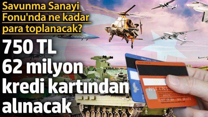 Ekonomim.com’un tahmini hesaplamasına göre, 61 milyon 955 bin 106 adet kredi kartından 750 lira Savunma Sanayi Fonu alındığında, 46 milyar 466 milyon 329 bin 428 TL (34,28 dolar/TL anlık kur üzerinden; 1 milyar 355 milyon 493 bin 857 dolar) gelir planlanıyor.
