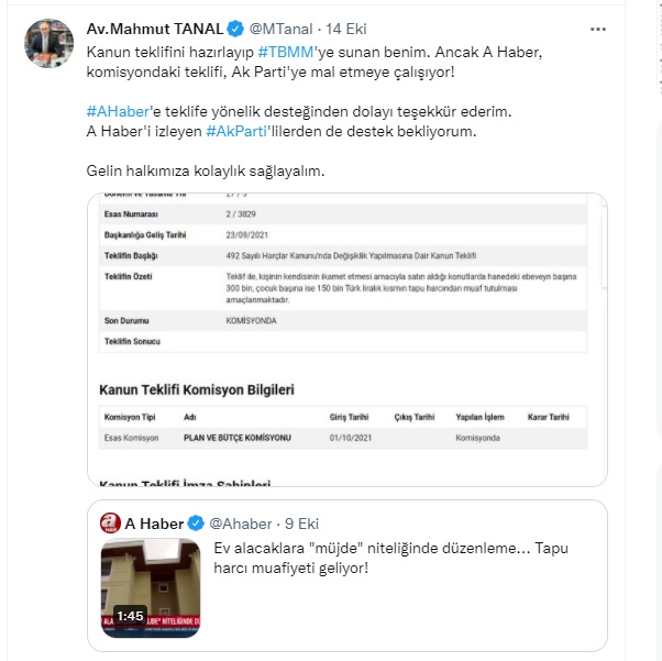 Tanal, bir başka paylaşımda ise “Kanun teklifini hazırlayıp TBMM'ye sunan benim. Ancak A Haber, komisyondaki teklifi, Ak Parti'ye mal etmeye çalışıyor! A Haber'e teklife yönelik desteğinden dolayı teşekkür ederim. A Haber'i izleyen Ak Parti'lilerden de destek bekliyorum. Gelin halkımıza kolaylık sağlayalım” diye yazdı.