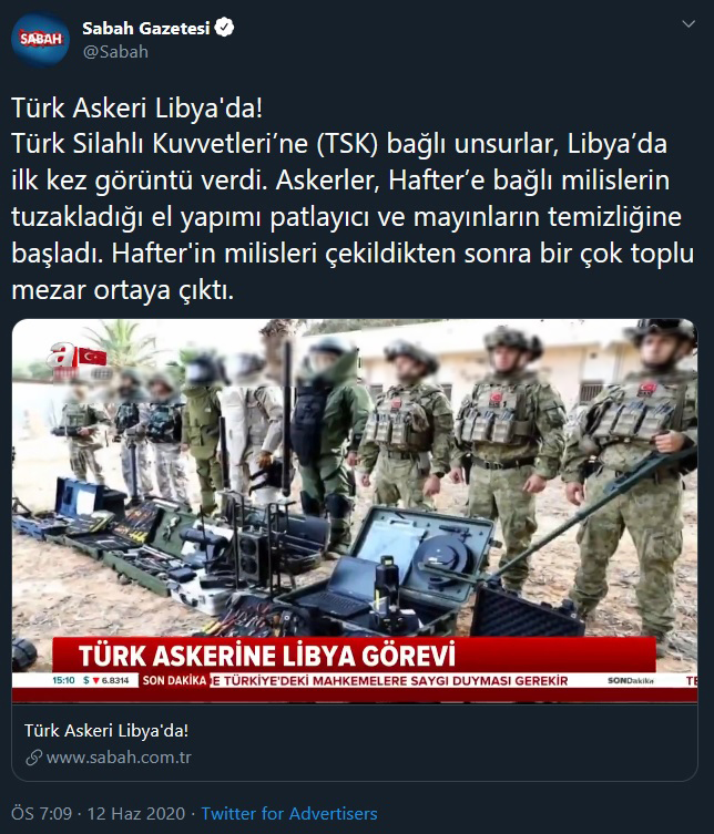 Sabah gazetesi de haberi sosyal medyadan, “Türk Askeri Libya'da! Türk Silahlı Kuvvetleri’ne (TSK) bağlı unsurlar, Libya’da ilk kez görüntü verdi. Askerler, Hafter’e bağlı milislerin tuzakladığı el yapımı patlayıcı ve mayınların temizliğine başladı” ifadeleriyle paylaştı.
