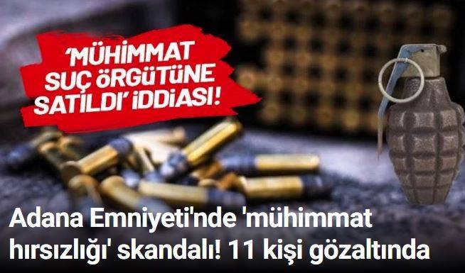 Adana Emniyet Müdürlüğü'nün deposunda 'mühimmat hırsızlığı' skandalı yaşandı. Adana Valiliğinin aktardığı bilgiye göre, depoda mühimmat çalınması üzerine emniyet harekete geçti. Soruşturma kapsamında 11 kişi gözaltına alındı.