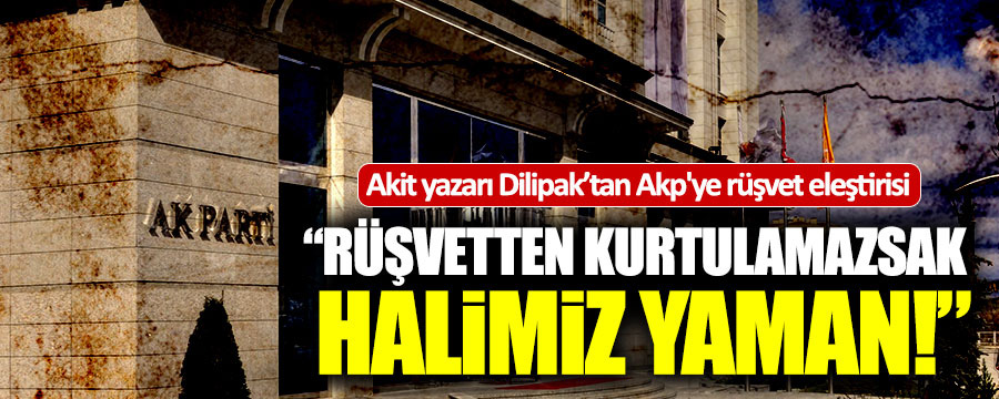 Dilipak bugünkü köşe yazısında rüşvet ve iltimasa dikkat çekerek, "Rüşvet ve iltimastan yakamızı kurtaramaz isek halimiz yaman!. Yaptıklarınız kovadaki su, rüşvet ve iltimas, diğer marazlar kova’daki deliktir. Kovada su bırakmaz tedbir almazsanız. Dikkat: Bir hırsız bir bağdan bir bostan çalarmış. Rüşvet alan biri bir bostan karşılığında bir bağı satarmış" ifadelerini kullandı.