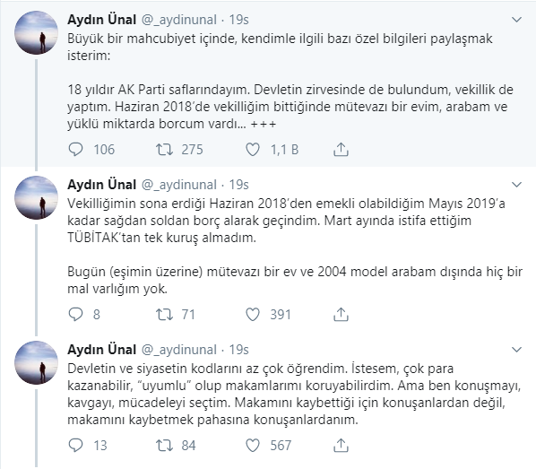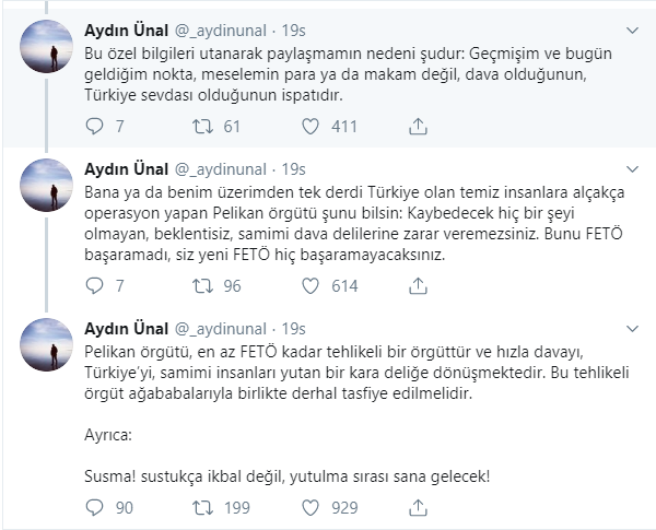 "Bana ya da benim üzerimden tek derdi Türkiye olan temiz insanlara alçakça operasyon yapan Pelikan örgütü şunu bilsin: Kaybedecek hiçbir şeyi olmayan, beklentisi, samimi dava delilerine zarar veremezsiniz. Bunu FETÖ başaramadı, siz yeni FETÖ hiç başarayamayacaksınız" diyen Ünal, Hazine ve Maliye Bakanı Berat Albayrak'a yakın olduğu ileri sürülen gruba ilişkin şunları da söyledi: