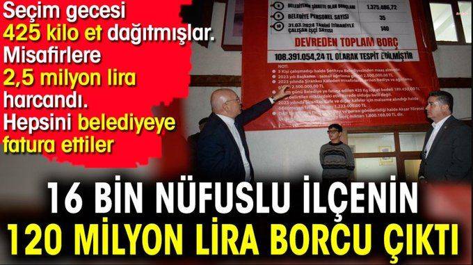 Yerel seçimlerde AKP’den CHP’ye geçen Erzurum Şahinkaya Belediyesi’nin geçmiş dönemden çıkan dev borcu dikkat çekti. AKP’li eski belediye başkanının seçim gecesi için alınan 425 kilo etin bedelini ve misafirler için harcanan 2,5 milyon lirayı belediyeye fatura ettiği öğrenildi. Yeni seçilen Belediye Başkanı Görbil Özcan, dev borcu belediyeye pankart olarak astı.