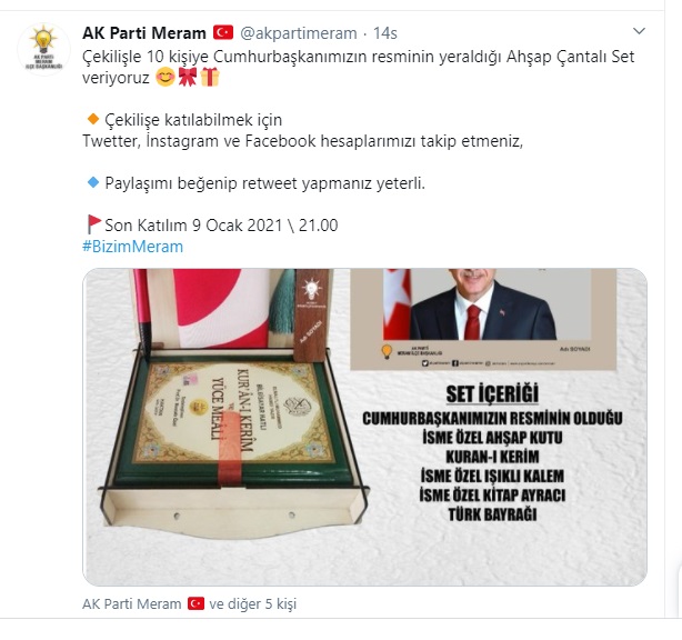 Paylaşımı sosyal medya hesabından yapan AKP teşkilatı takip edildikleri takdirde de çekilişle takipçilerine hediye evreceklerini belirtti.