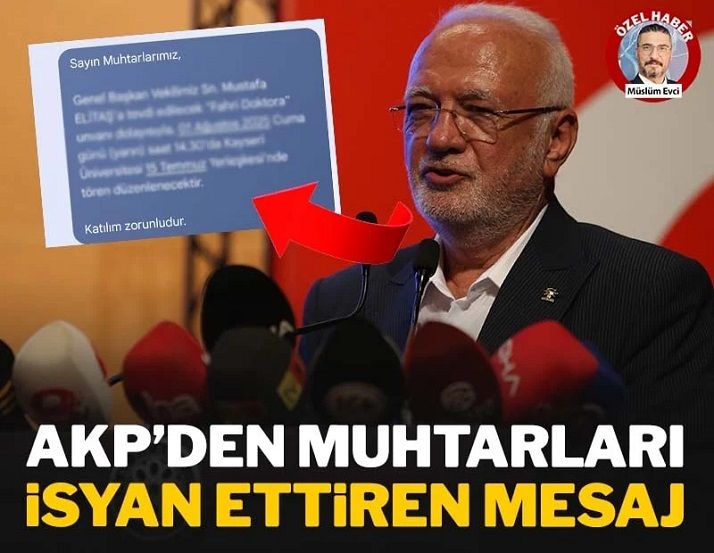 “Sayın Muhtarlarımız, Genel Başkan Vekilimiz Sn. Mustafa ELİTAŞ’a tevdi edilecek "Fahri Doktora" unvanı dolayısıyla, 01 Ağustos 2025 Cuma günü (yarın) saat 14.30’da Kayseri Üniversitesi 15 Temmuz Yerleşkesi’nde tören düzenlenecektir. Katılım zorunludur.”