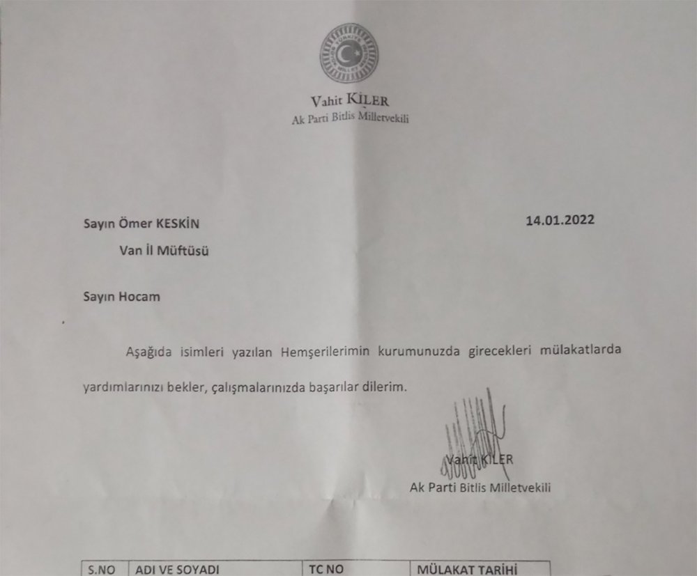 AKP Bitlis Vahit Kiler, Keskin'e hitaben 'Sayın Hocam' diyerek, "Aşağıda isim leri yazılan hemşehrilerimin kurumunuzda girecekleri mülakatlarda yardımlarınızı bekler, çalışmalarınızda başarılar dilerim" ifadelerini kullandı. Gönderilen talimat yazısı ve listede AKP'li Kiler'in ıslak imzası da yer aldı.