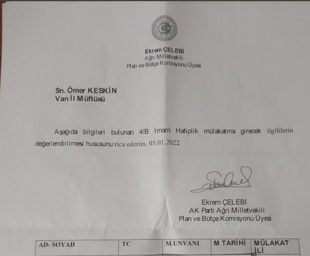 Van'daki alımlar için AKP Ağrı Milletvekili, Plan ve Bütçe Komisyonu Üyesi Ekrem Çelebi de müftü Keskin'den torpil istedi. Çelebi'nin gönderdiği talimay yazısında, "Aşağıda bilgileri bulunan 4/B İmam Hatiplik mülakatına girecek ilgililerin değerlendirilmesi hususunu rica ederim" ifadelerini kullandı.