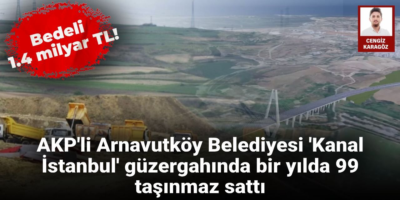 Kanal İstanbul projesine ilişkin tartışmalar sürerken proje güzergahında yer alan AKP'li belediyeler tartışmalı uygulamalara gündemden düşmüyor. Sık sık Kanal İstanbul güzergahında arsa satmasıyla gündeme gelen AKP'li Arnavutköy Belediyesi'nin taşınmaz satışlarının bilançosu faaliyet raporlarına da yansıdı. Arnavutköy Belediyesi 2024 yılı Faaliyet Raporu'na göre Mustafa Candaroğlu'nun başkanlığını yaptığı belediye bir yılda proje güzergahında 99 taşınmazı satışa çıkardı. Emlak ve İstimlak Müdürlüğü'nün 2024 verilerine göre belediye eliyle satışa çıkarılan taşınmazların 2024 yılındaki bedeli 1 milyar 471 milyon 702 bin 789 TL oldu.