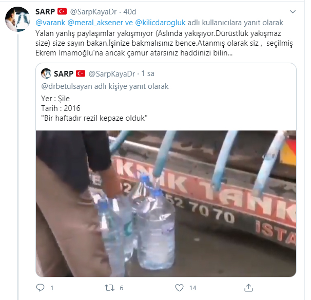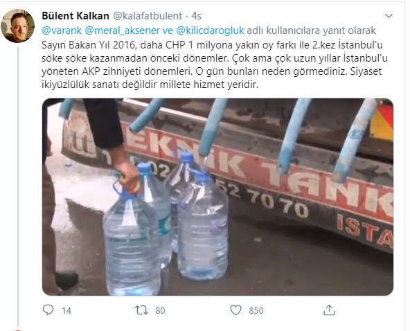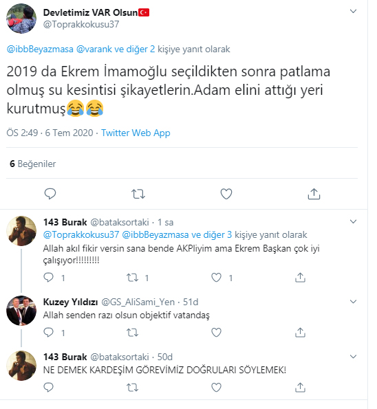 "2019 da Ekrem İmamoğlu seçildikten sonra patlama olmuş su kesintisi şikayetlerin.Adam elini attığı yeri kurutmuş" diyen AKP'li trole AKP'li yurttaş, "Allah akıl fikir versin sana bende AKPliyim ama Ekrem Başkan çok iyi çalışıyor!!!!!!!!!" diye yazdı.