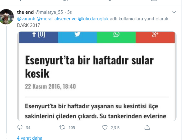Söz konusu paylaşımına CHP Genel Başkanı Kemal Kılıçdaroğlu ve İYİ Parti Genel Başkanı Meral Akşener'i de etiketleyen Varank, "Merakla beklediğiniz dizinin yeni sezonu yayınlanmış. Olay İstanbul'da geçiyor. DARK (İstanbul), Yıl: 2020, Tür: Dram, IMDB: 0.0. İyi seyirler" dedi.