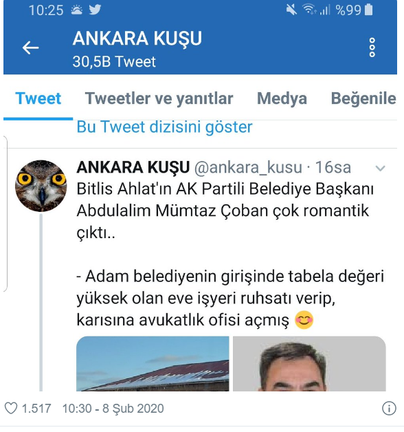 Twitter'da Ankara Kuşu adlı hesabın yaptığı paylaşıma göre, AKP'li Çoban'ın iş yeri ruhsatı verdiği belediyeye ait binada, eşi tarafından avukatlık ofisi açtı.