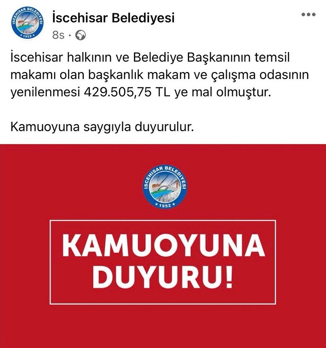 “İscehisar halkının ve Belediye Başkanının temsil makamı olan başkanlık makam ve çalışma odasının yenilenmesi 429.505,75 TL ye mal olmuştur. Kamuoyuna saygıyla duyurulur.”