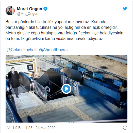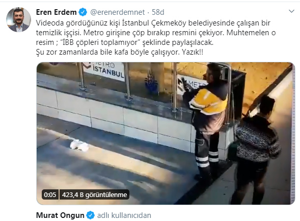İBB sözcüsü Murat Ongun twitter hesabından paylaştığı görüntüye ilişkin “Metro girişine çöpü bırakıp sonra fotoğraf çeken ilçe belediyesinin bu temizlik görevlisini kamu vicdanına havale ediyoruz.” açıklamasında bulundu.