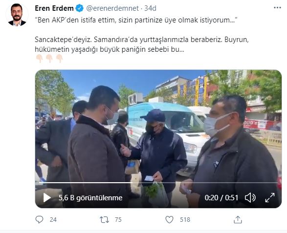 Erdem'in yanına gelen vatandaş AKP'den istifa ettiğini ve ailecek CHP'ye geçmek istediklerini ifade etti. Vatandaş, "Neden diyeceksin; dinle sermaye yapan kişinin ne dini ne imanı olur" dedi.