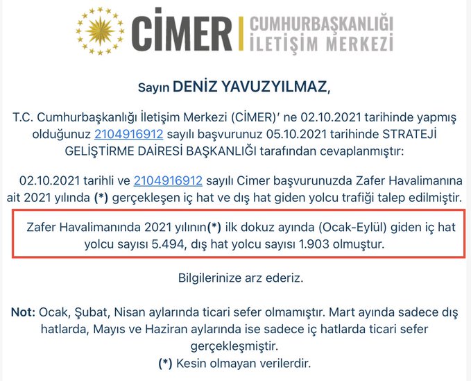 Zarara ilişkin belgeler de paylaşan Yavuzyılmaz, ''AKP , Zafer Havalimanı'nındaki kendi zarar rekorunu kırdı. 2021(ilk 9 ay) Garanti edilen yolcu sayısı: 988.299 Gerçekleşen yolcu sayısı: 7.397 Uçmayan yolcu sayısı: 980.902 Hata payı: % 99 Garanti ödemesi: 5.202.156 Avro" ifadelerini kullandı.