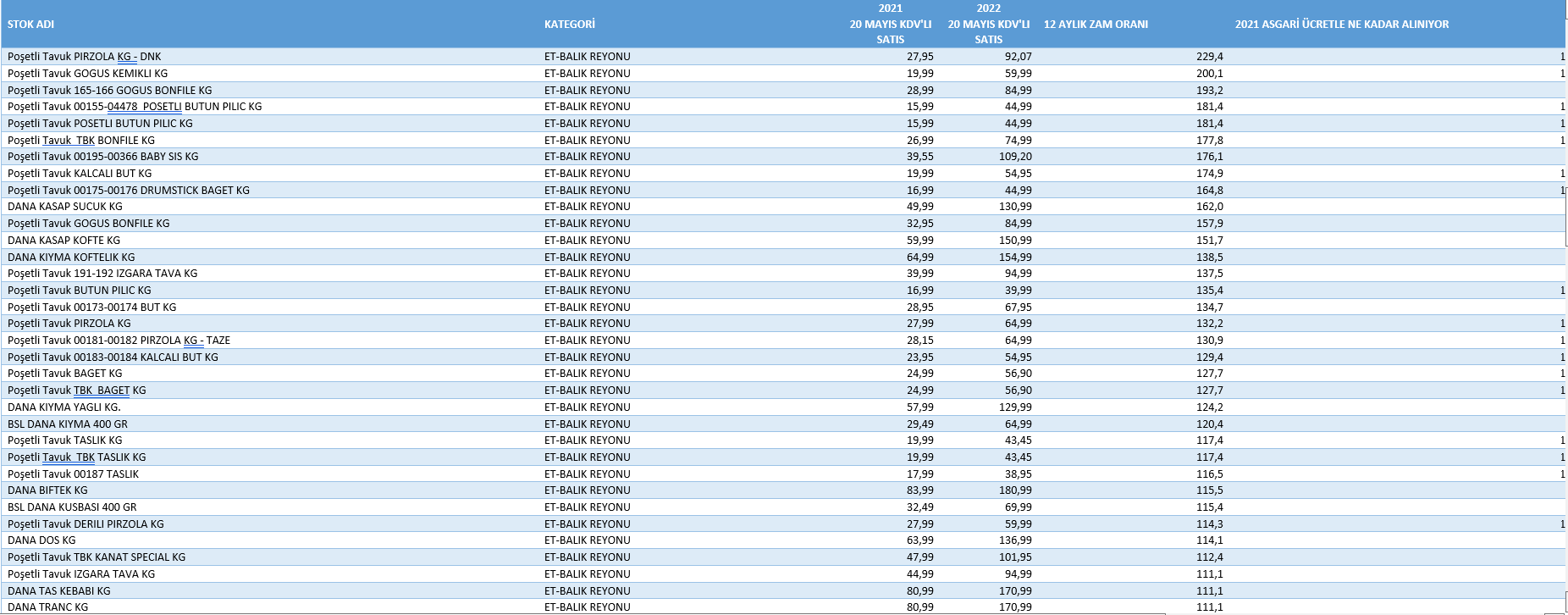 Araştırmaya göre sebze ve meyveye 1 yılda ortalama yüzde 100 zam geldi. Et, tavuk, balık ürünleri ortalama yüzde 102,7 zamlandı. Kuru gıdada ortalama zam oranı yüzde 89,7 olurken, şarküteri ürünlerinde zam yüzde 99’u buldu.