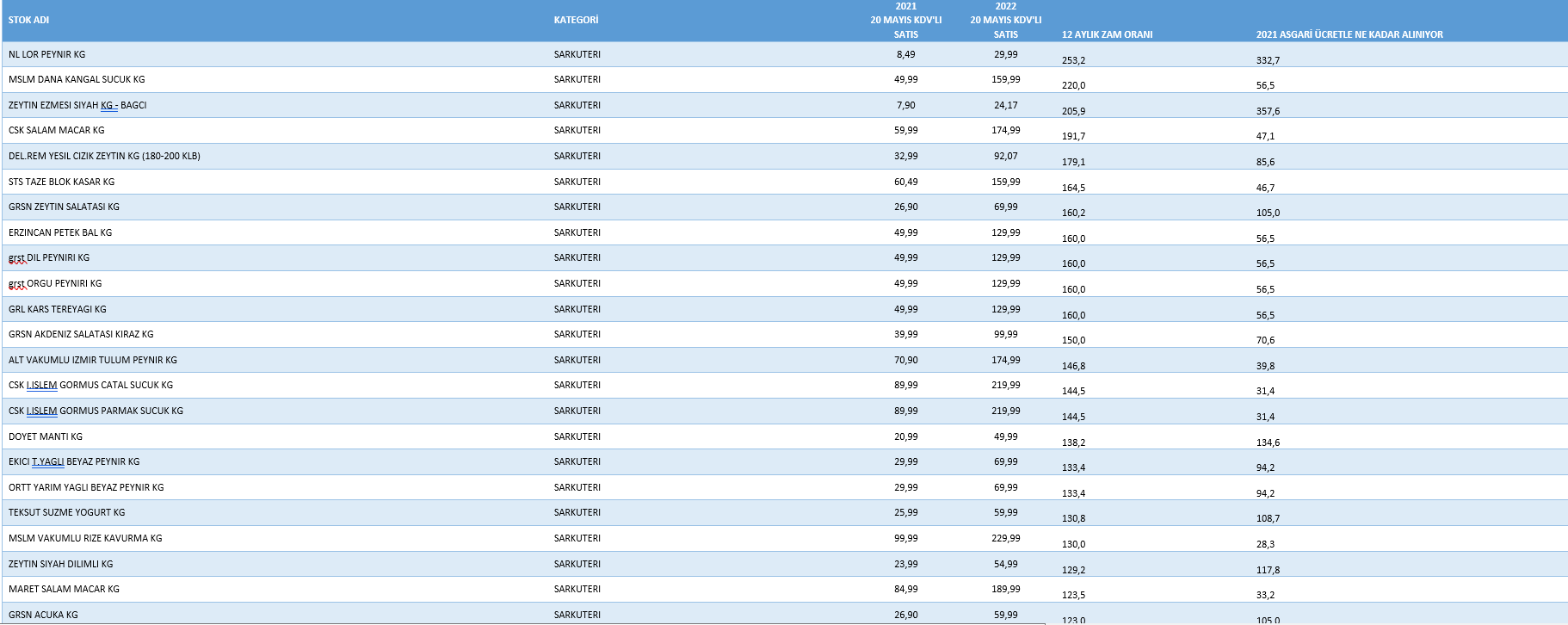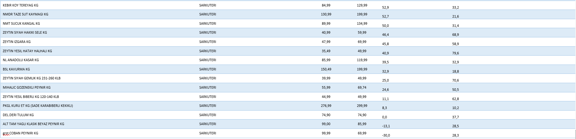 Şarküteri reyonundaki 86 üründe 1 yıllık ortalama zam oranı yüzde 99 olurken zam şampiyonu yüzde 253 ile lor peyniri, yüzde 220 ile kangal sucuk ve yüzde 205 ile zeytin ezmesi oldu.