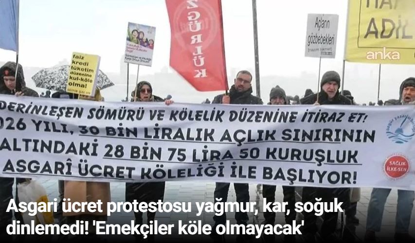 Açlık ve yoksulluk her geçen yıl bir önceki yıla göre daha da derinleştiği; sömürü ve kölelik düzeni daha bir pekiştiği için meydanlardayız! İnsan haysiyet ve özgürlüğünü hedef alan, insan onurunu çiğneyen bu harâmi düzene karşı yılın bütün günlerinde itirazlarımızı sürdürmeye devam edeceğiz! Susmayacağız! Geçtiğimiz hafta Asgarî Ücret Tespit Komisyonunun kararıyla 2026 yılı için geçerli olacak Asgarî Ücret, 28 bin 75 lira 50 kuruş olarak ilan edildi. Böylece bir önceki yıla göre sadece yüzde 27’lik bir artış yapılmış oldu. TÜRKİŞ araştırmalarına göre 4 kişilik bir ailenin yoksulluk sınırı 98 bin 188 lira, açlık sınırı ise 30 bin 143 lira olarak tespit edilmiştir. İşçiler yeni ücretlerini ancak 31 Ocak 2026’da alacak. O zamana kadar açlık sınırının nerede olacağını düşünmek bile istemiyoruz.”