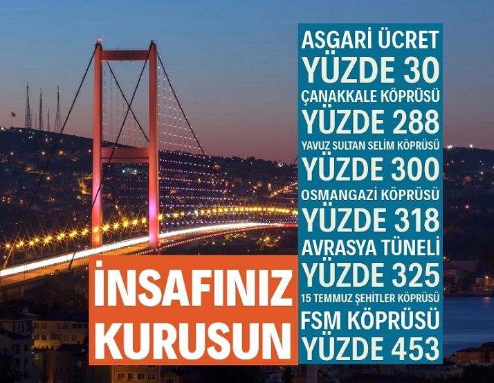 Son 1 yıl 2 haftaya bakıldığında AKP'nin yaptığı astronomik zamların daha belirgin görüldüğünü aktaran Yavuzyılmaz “Çanakkale Köprüsü'nde araç geçiş ücretlerine son bir yıl iki haftada yapılan zam oranı yüzde 288. Yavuz Sultan Selim Köprüsü'nde yüzde 300, Osmangazi Köprüsü'nde yüzde 318, Avrasya Tüneli'nde yüzde 325, 15 Temmuz Şehitler Köprüsü ve Fatih Sultan Mehmet Köprüsü'nde de son bir yıl iki haftada yapılan zam oranı yüzde 453" dedi.