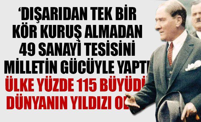 Dışarıdan tek bir kör kuruş almadan 49 sanayi tesisini milli kaynaklarla, milletin gücüyle yaptı. Şekerden çimentoya, camdan tekstile, uçaktan silaha gerçek bir devrim yarattı. 1923'ten 1938'e kadar hem dış borçları ödedi, hem 1 dolar 90 kuruş palitesini tutturdu, hem 15 yılda % 115 büyüdü.