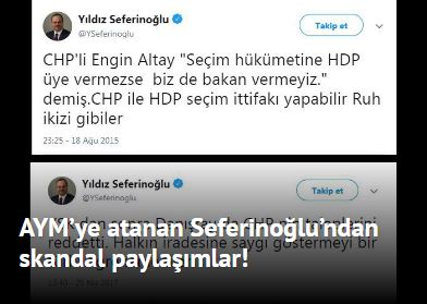 Seferinoğlu’nun kişisel Twitter hesabından muhalefet partileri aleyhine birçok paylaşım yaptığı ortaya çıktı. Özellikle CHP ve HDP’yi hedef alan yeni AYM Üyesi, bundan böyle muhalefet partilerinin yaptığı başvuruları ‘değerlendirecek!’