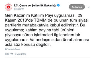 Poşetin ardından “geri kazanım payı alınacak” ambalajlar kamuoyundan yoğun tepki çekince Bakanlık önce sosyal medya hesaplarından haberleri yalanladı. Geri Kazanım Katılım Payı uygulamasının TBMM’de tüm partilerin mutabakatıyla kabul edildiğini söyledi. 29 Kasım 2018’de TBMM’de kabul edilen yasa teklifine CHP, İYİ Parti ve HDP’nin red oyu verdiği ortaya çıktı. Bu partilerin tasarıyı reddettiğine dair tutanaklar TBMM sitesinde yer alıyor.: https://www.tbmm.gov.tr/tutanak/donem27/yil2/ham/b23196oylama.htm