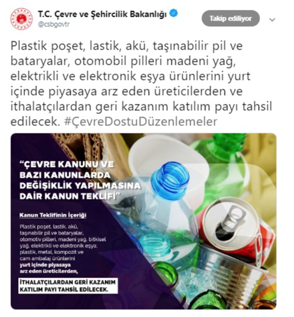 Resmi twitter hesabından “Ambalajlı ürünlerden ücret alınacağı yönündeki haberler kesinlikle doğru değildir” paylaşımı yapan Bakanlık, bu konuda yine kafaları karıştırdı. TBMM’de AKP ve MHP oylarıyla yasalaşan kanun metninde içecek ambalajları başta olmak üzere, ilaç ve elektronik eşya ambalajları dahil “geri kazanım katkı payı” adı altında alınacak ücretler belirlendi. Geri kazanım katkı payının üreticiden alınacağı söylesen de üreticinin artan maliyetlerini tüketiciye yansıtmasının önüne geçecek herhangi bir düzenleme yapılmadığı için katkı payı miktarlarının tüketiciye de yansıması kaçınılmaz olacak.
