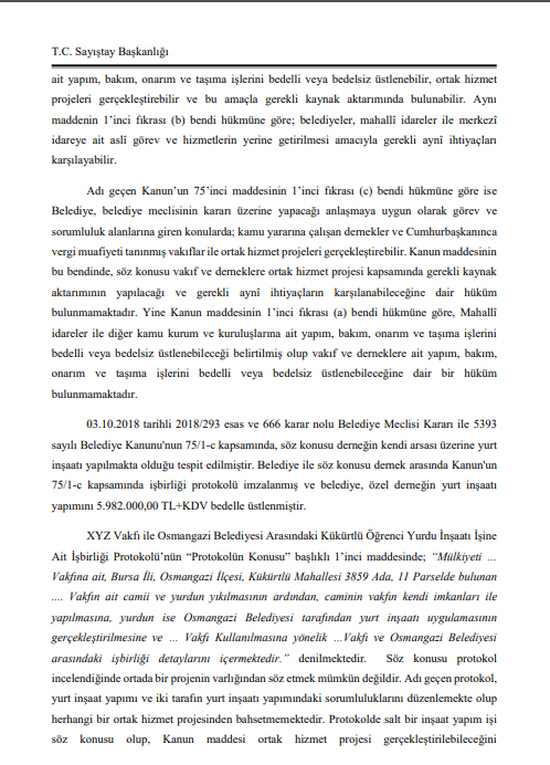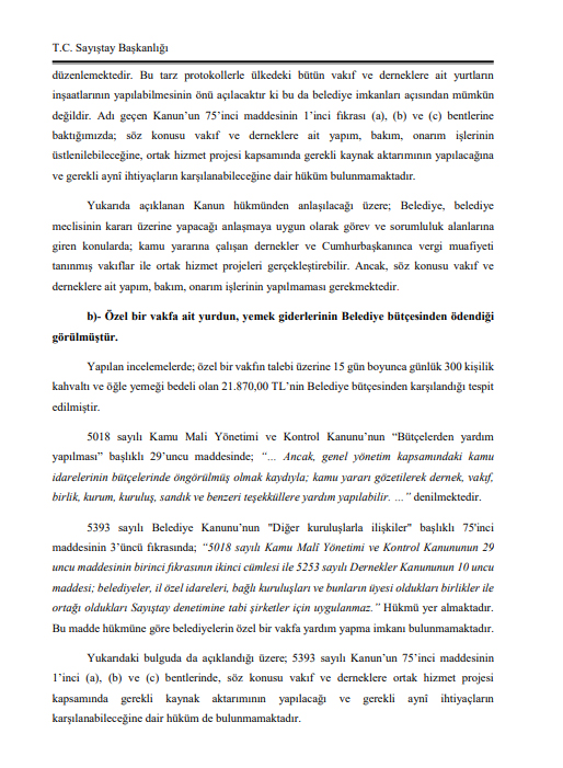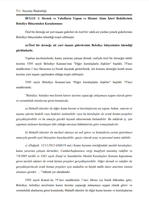 Sayıştay’ın denetim raporunda yasaların belediyelerin derneklerle ortak projeler geliştirebilmesine izin verdiği belirtildi. ancak yurt yapımına ilişkin protokole bakıldığında ortak projeden söz edilemeyeceği belirtildi. Raporda “bu tarz protokollerle ülkedeki bütün vakıf ve derneklere ait yurtların inşaatlarının yapılabilmesinin önü açılacaktır ki bu da belediye imkanları açısından mümkün değildir” denildi. Raporda İlim Yayma Vakfının adı verilmedi. ‘… vakfı’ ifadesi yer aldı.