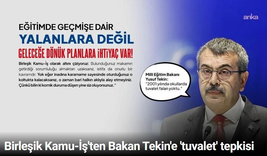 Birleşik Kamu-İş Konfederasyonu, Milli Eğitim Bakanı Yusuf Tekin'in 'AK Parti'den önce okullarda tuvalet olmadığına' ilişkin açıklamalarına gösteren yazılı bir açıklama yaptı. Açıklamada, şu görüşlere yer verildi: