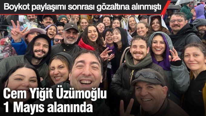Oyuncular Sendikası ise 1 Mayıs kutlamalarının yapıldığı alana koşarak girdi. Koşarak alana giren isimler arasında boykot çağrısı nedeniyle gözaltına alınan oyuncu Cem Yiğit Üzümoğlu da yer aldı.