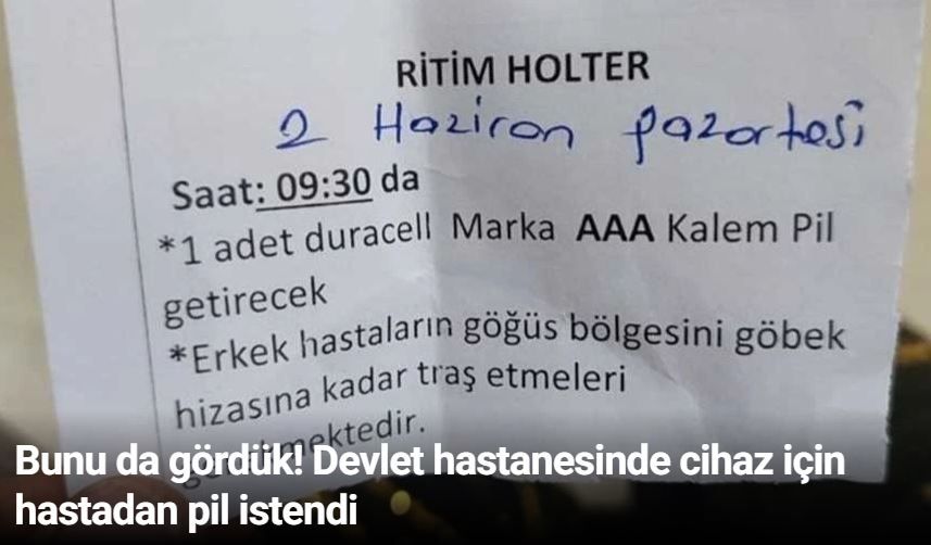 Kalp ritim bozukluklarının tespitinde kullanılan “Holter” cihazı için randevuların bir ay sonrasına verildiği, acil durumdaki hastalara dahi “bekleyin” denildiği ortaya çıktı. Ancak kamuoyunu asıl şaşkına çeviren, hastalardan cihaza takılmak üzere “Duracell marka AAA pil” getirmelerinin istenmesi oldu.