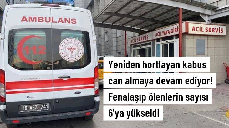 Bursa'nın Yıldırım ilçesinde sahte alkolden zehirlendiği şüphesiyle hastaneye kaldırılan bir kişinin daha hayatını kaybetmesiyle ölü sayısı 6'ya yükseldi.