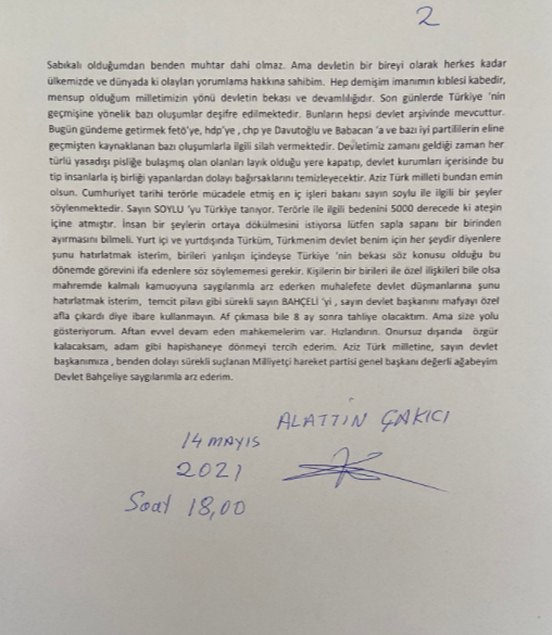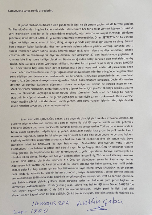 Af çıkmasa bile 8 ay sonra tahliye olacaktım. Ama size yolu gösteriyorum. Aftan evvel devam eden mahkemelerim var. Hızlandırın. Onursuz dışarıda özgür kalacaksam, adam gibi hapishaneye dönmeyi tercih ederim. Aziz Türk milletine, sayın devlet başkanımıza , benden dolayı sürekli suçlanan Milliyetçi hareket partisi genel başkanı değerli ağabeyim Devlet Bahçeliye saygılarımla arz ederim.”