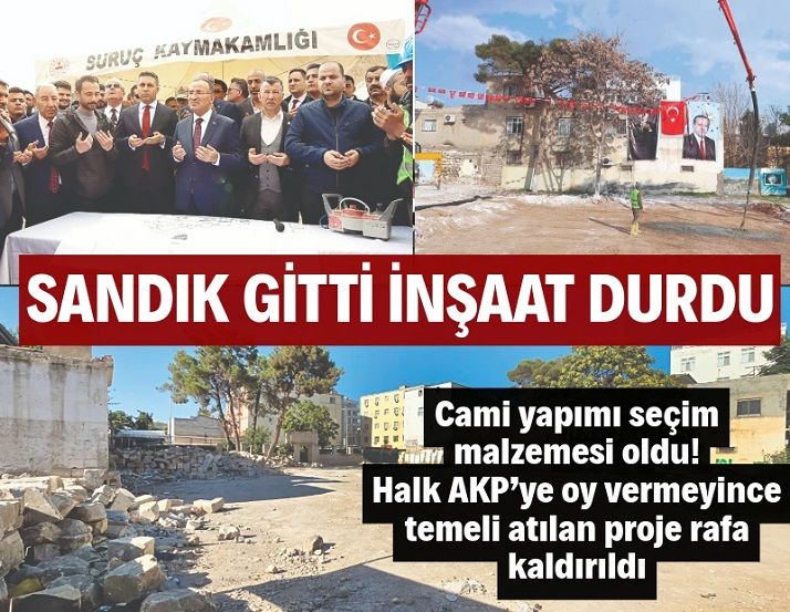 Şanlıurfa’nın Suruç ilçesinde 6 Şubat depremlerinde yıkılan Ulu Cami’nin yerine yapılacağı duyurulan caminin temeli, 4 Mart 2024’te, seçimlere yalnızca 27 gün kala o dönem Adalet Bakanı olan TBMM Başkanvekili Bekir Bozdağ’ın da katıldığı törenle atıldı. Ancak seçim kaybedilince proje tamamen unutuldu. Aradan geçen 491 günde cami inşaatında tek çivi çakılmadı.