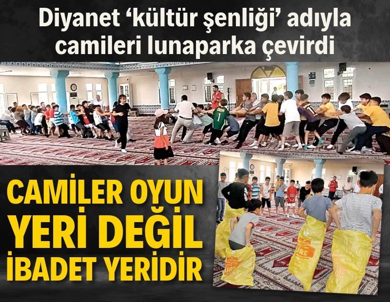 “TEK Parti Dönemi”ne çamur atmak için tarihi gerçekleri çarpıtarak “Camileri ahır yaptılar” propagandası yürüten iktidar, “Yılsonu etkinliği” ve “Kültür Şenliği” bahanesi ile adeta camileri lunaparka çevirdi. Çocuklara camide halat çekme ve çuval yarışları, bilek güreşi, dans gösterileri, tekvando yaptırıldı, bowling ve futbol oynattırıldı, palyaço gösterisi izlettirildi.
