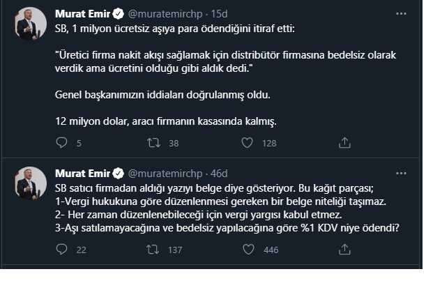 Bu nakit akış yönetimini sağlamak için Sinovac firmasını da temsil eden distribütör firmasına bedelsiz olarak verdik ama biz sizden ücretini olduğu gibi aldık. Bunu üretici firma söylüyor." demişti.