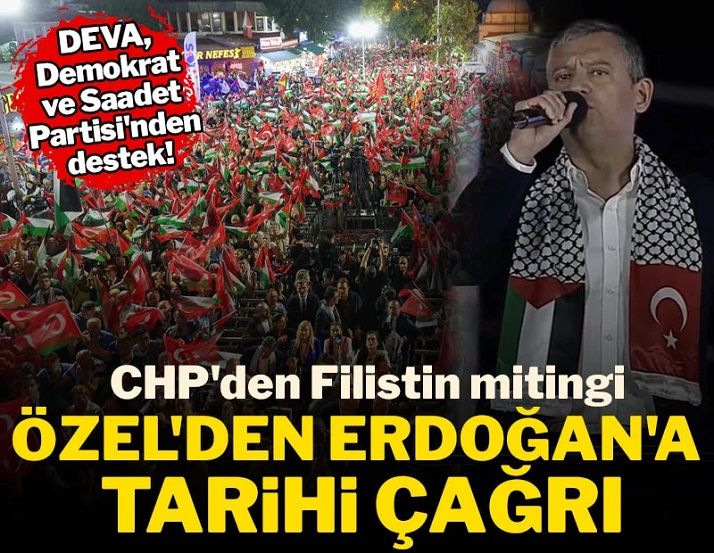 CHP’nin cumhurbaşkanı adayı Ekrem İmamoğlu’nun tutuklanmasının ardından her hafta çarşamba günleri İstanbul’un bir ilçesinde, her hafta sonu ise Türkiye’nin farklı illerinde düzenlediği "Millet İradesine Sahip Çıkıyor" mitingleri bu hafta Filistin'e destek olmak amacıyla "Özgür Filistin, Tam Bağımsız Türkiye" sloganı ile Eyüpsultan ilçesinde düzenlendi. CHP Genel Başkanı Özgür Özel, kalabalığa seslendi. Cumhurbaşkanı Erdoğan'a çağrıda bulunan Özel, "Bugün tarihin doğru tarafında olmaya katliamın karşısında olmaya geldik. Sumud filosu Girit açıklarında saldırıya uğradı. Buradan Erdoğan'a sesleniyorum, o filoya sahip çıkın, koruyun ne olursa olsun!" dedi.