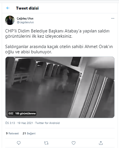 Çağdaş Ulus paylaşımında, "CHP'li Didim Belediye Başkanı Atabay'a yapılan saldırı görüntülerini ilk kez izleyeceksiniz. Saldırganlar arasında kaçak otelin sahibi Ahmet Orak'ın oğlu ve abisi bulunuyor. " ifadelerini kullandı.