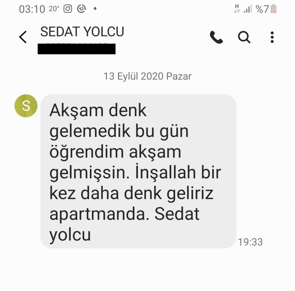 Öte yandan saldırıyı gerçekleştiren Sedat Yolcu'nun 13 Eylül Pazar günü Serkan Topalan'a tehdit mesajı gönderdiği iddia edildi. Yolcu mesajında şu ifadeleri kullandı: "Akşam denk gelemedik bu gün öğrendim akşam gelmişsin. İnşallah bir kez daha denk geliriz apartmanda. Sedat yolcu"